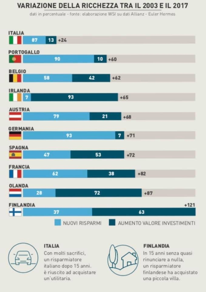 Purtroppo, da studi recenti, è emerso che gli italiani pur avendo una forte propensione al risparmio non hanno sviluppato, come nelle altre economie, una idonea cultura finanziaria. Questo si è tradotto in un differenziale di rendimento enorme e facilmente riscontrabile nell'infografica sottoriportata che al contempo ci aiuta a comprendere quanto sia importante investire sul lungo periodo.